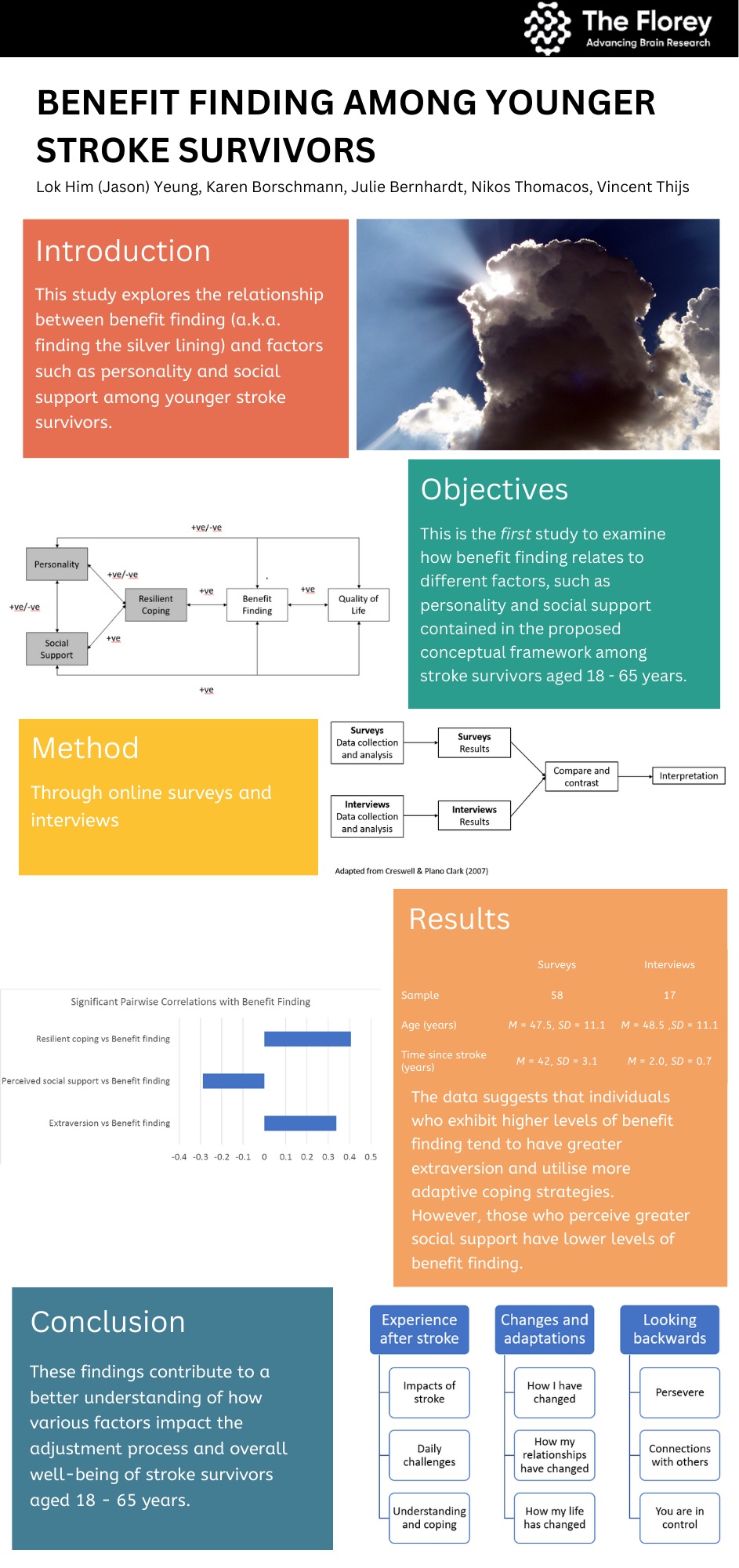 The first set of results is from a team at The Florey in Australia, the largest brain research centre in the Southern Hemisphere. Their study explores the relationship between benefit finding and factors such as personality and social support amongst younger stroke survivors.