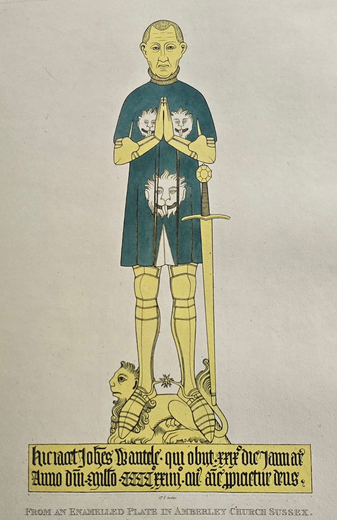Nevermind, I see it now that the picture is enlarged. I thought it was a cartoon character wearing short and a tee shirt with another mop headed character sticking his tongue out at us all. It seemed funny. I suppose those are lions, and an armoured cover for a knight of maybe the holy roman impire???