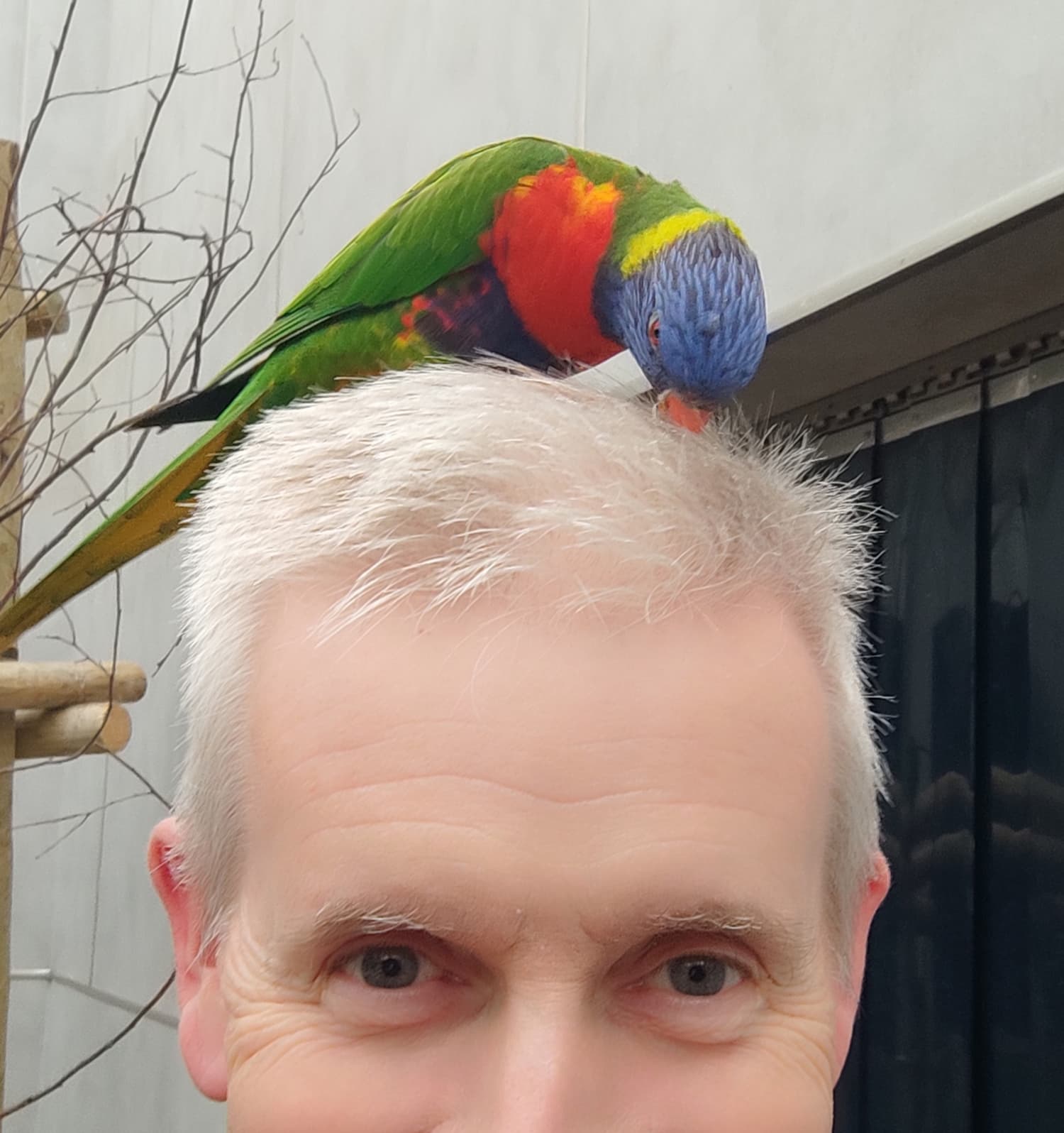 Went out with my DSLR to Colchester Zoo this week, will post one or two later. In the meantime here’s a selfie of me having my thatch inspected by a Rainbow Lorikeet