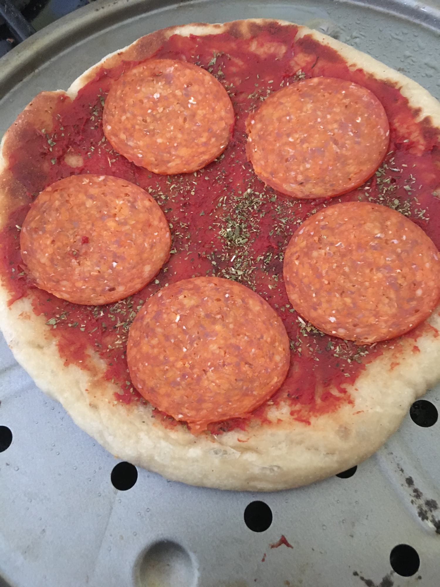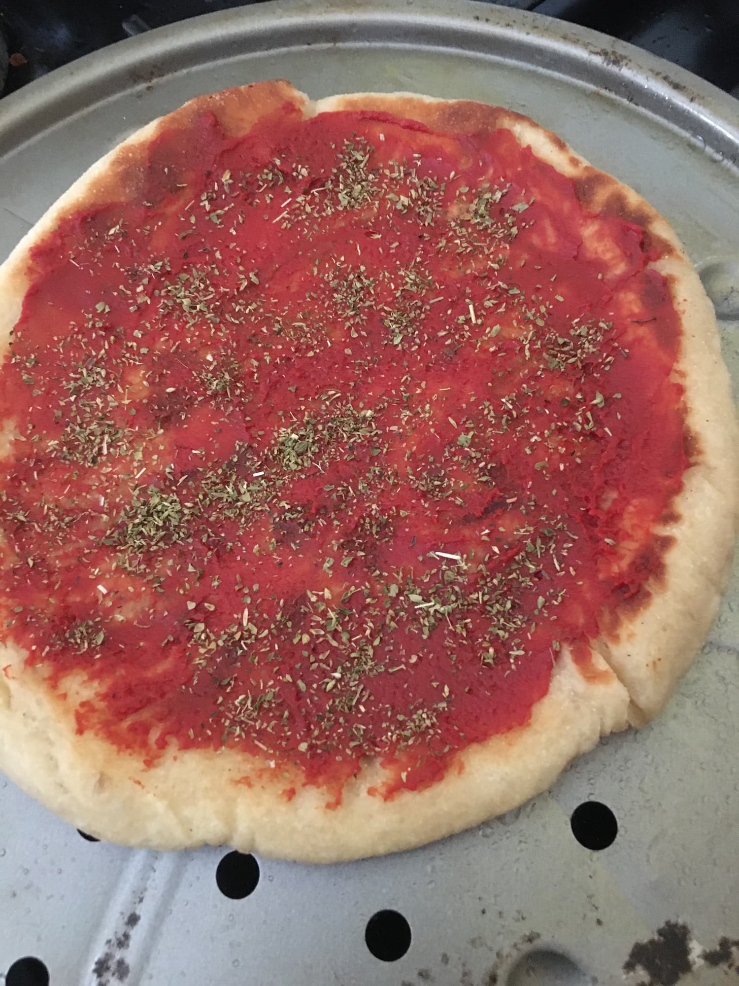 Once cooled down a bit we start to decorate the pizza. Tomato puree is spread over each base.