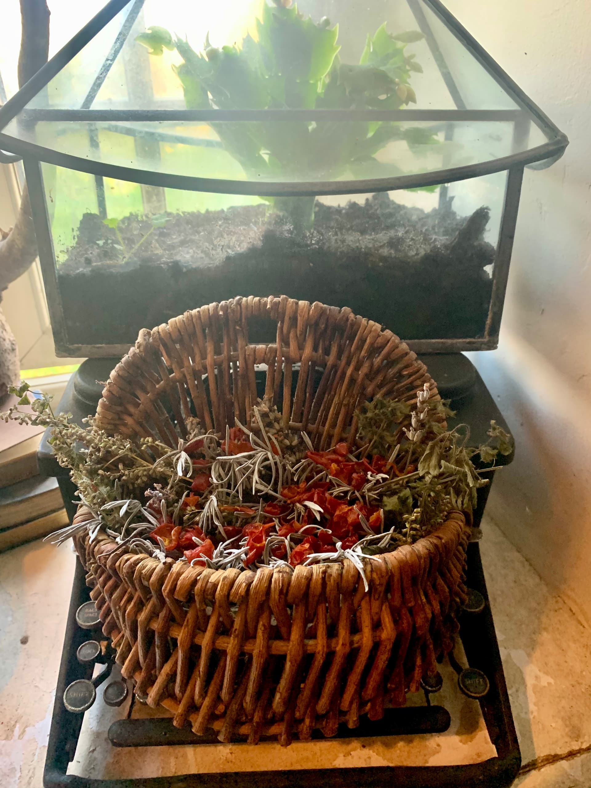 The ongoing cycle of scent in my house. Remember those rose hips I used for perfume? After I reached the desired concentration of fragrance, I removed the rose hips, and dried them. Then added them to one of my hanging potpourri baskets. This basket is a mixture of wormwood, lavender, lemon balm and mugwort. When Winter is over, I empty my potpourri containers, and ready them for new bouquets collected over Spring and Summer. The discarded potpourri goes into my kindling bucket, and when Winter arrives again, it makes a sweet smelling kindling for lighting fire. The ash is then put on parts of the garden. Full circle.